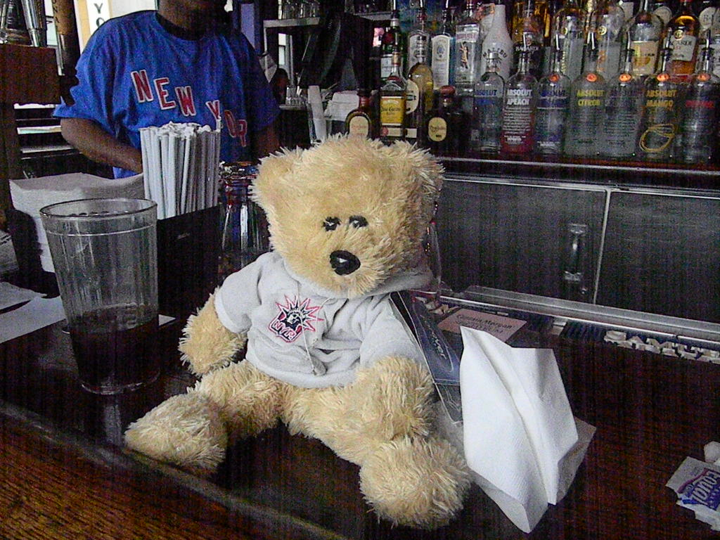 Gabby the Ranger bear anxiously awaits the opening faceoff while dining at Friday's.