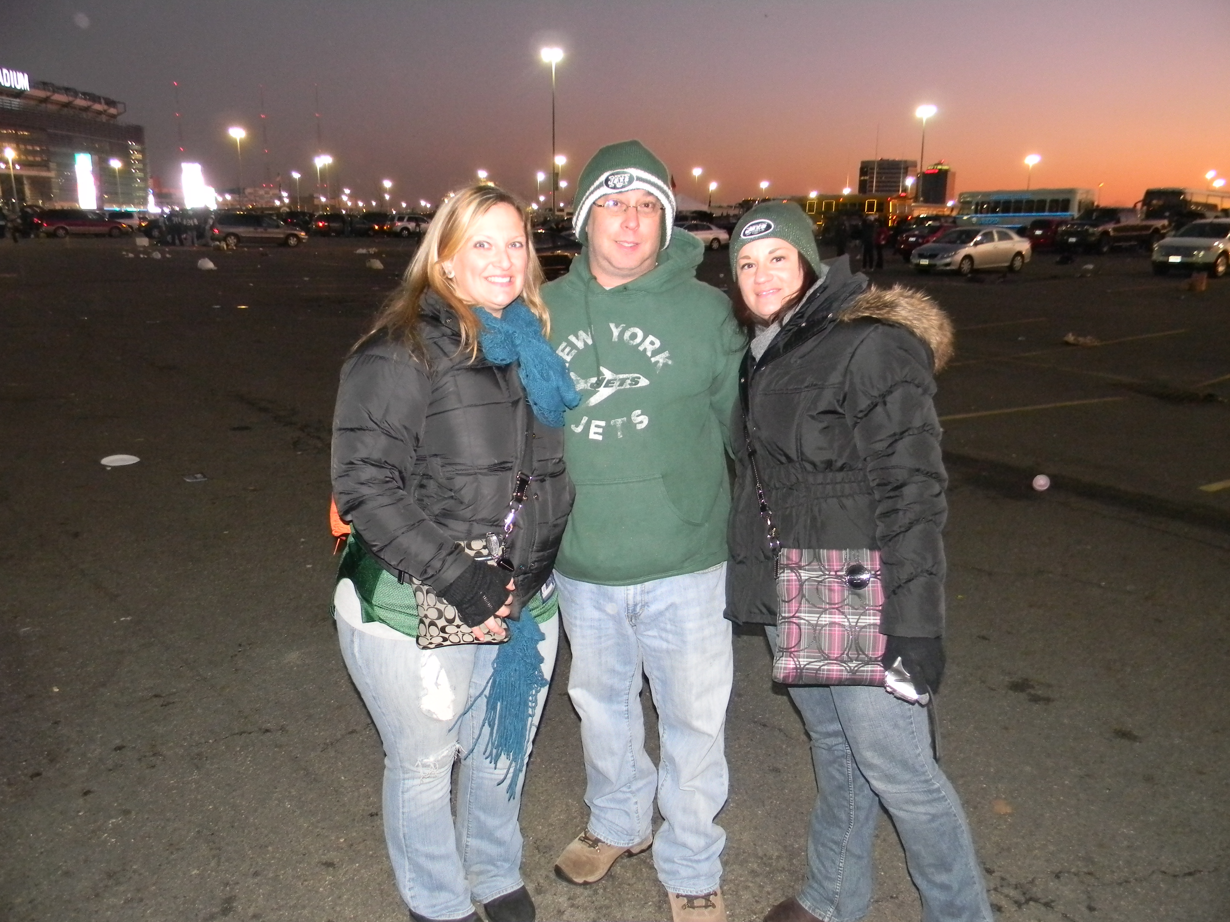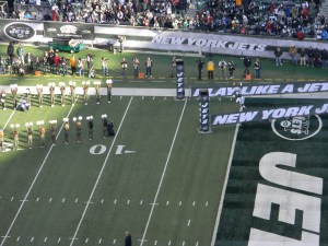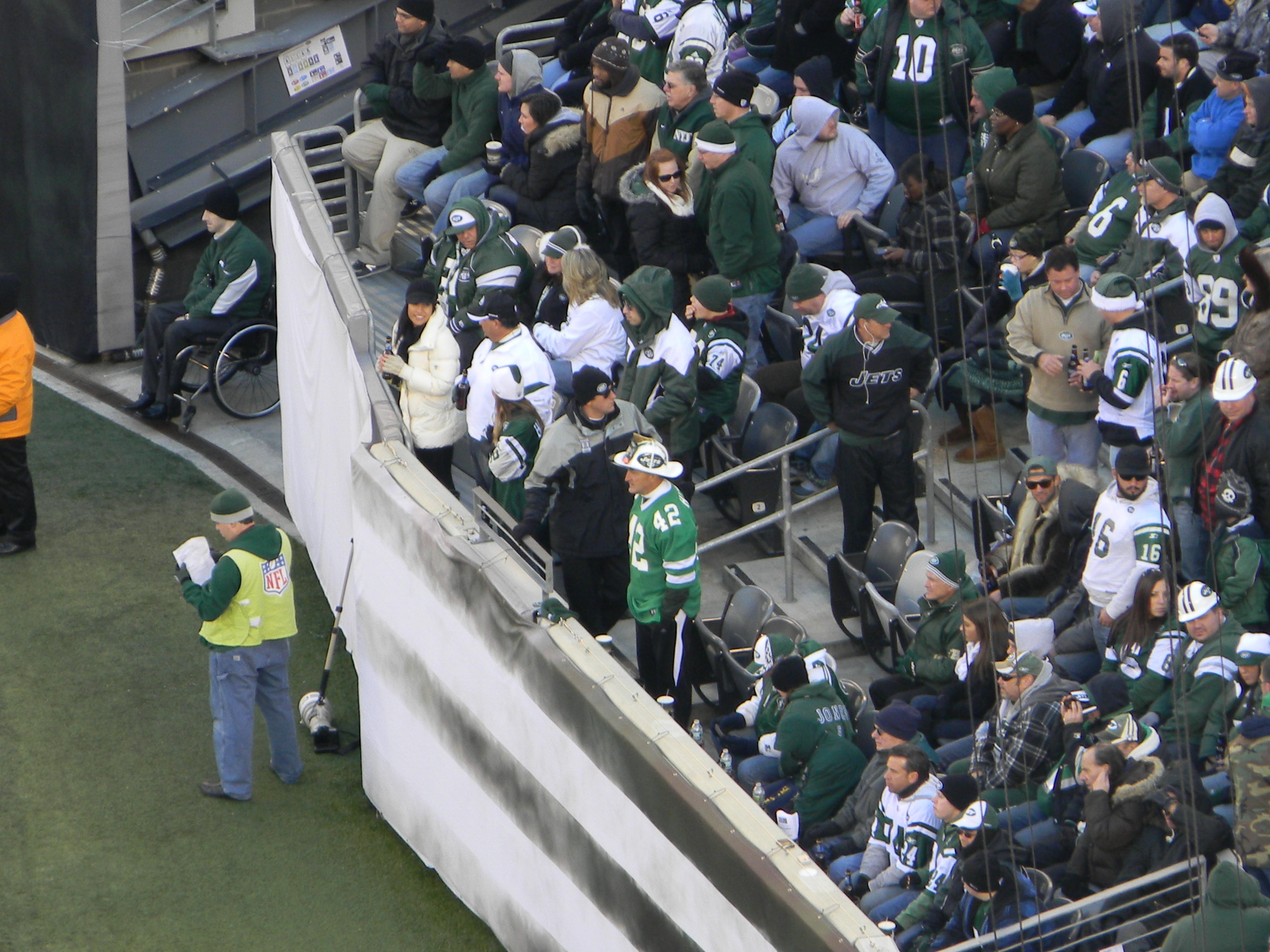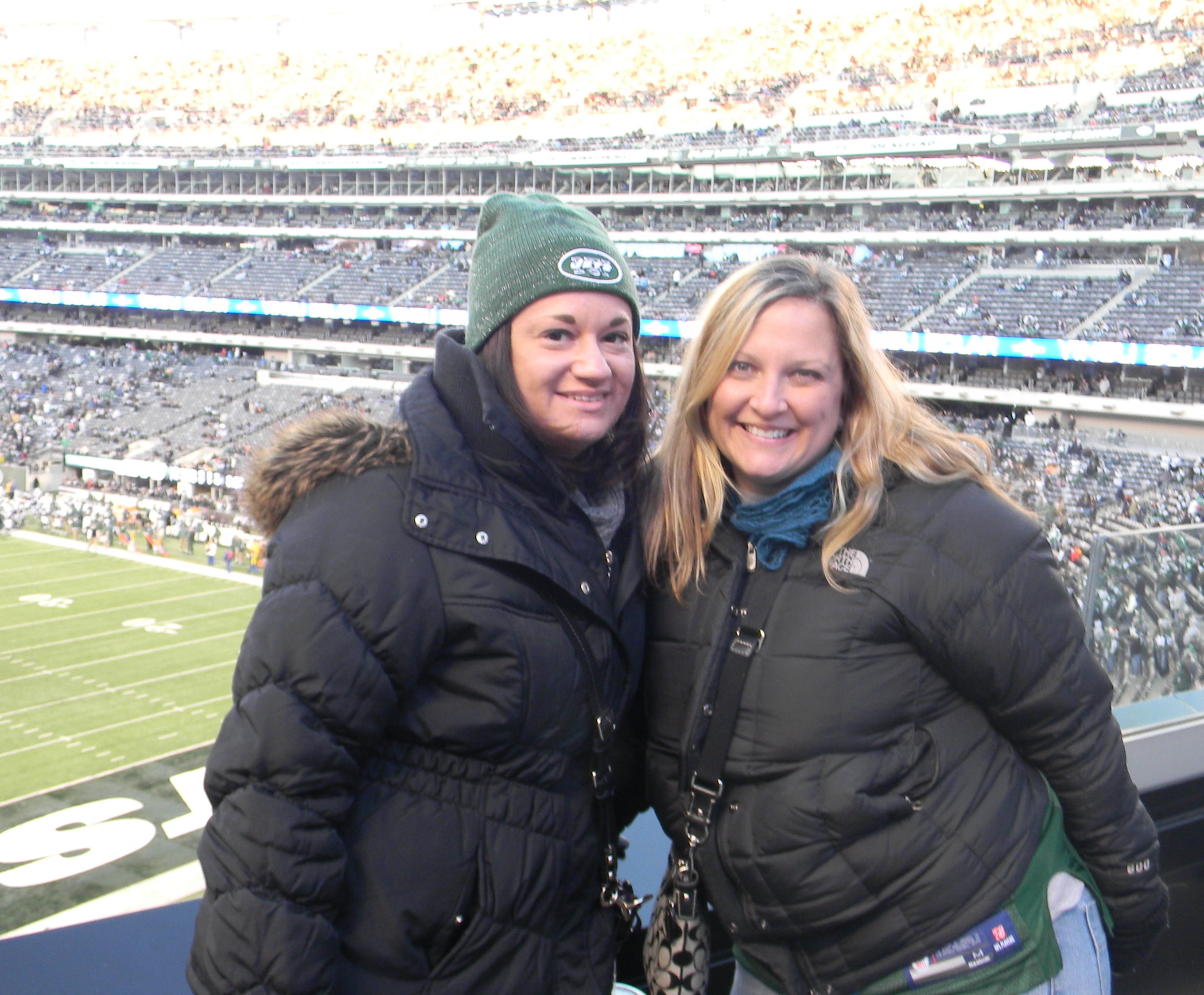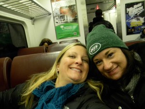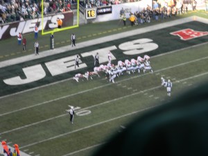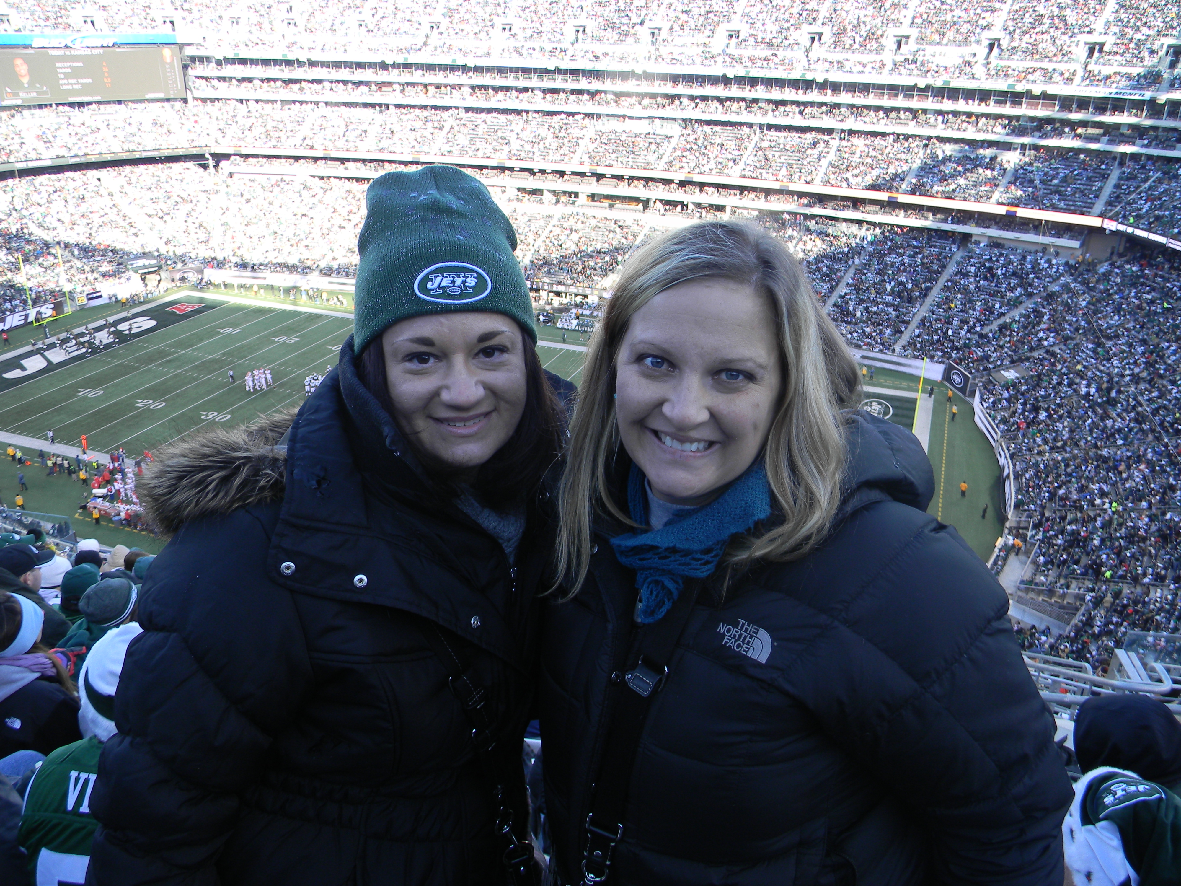Of course, not on the day I was scheduled to go a game. But as you see, my friend and I dressed appropriately. A few years ago, I read an article about dressing for games during the playoffs at Lambeau Field. I remember the guy had like 10 different layers, but most importantly, thermals with the butt flap. We don’t have it that bad, at least, not yet. But for me, I had thermals on, a sweatshirt, my Jets jersey, jeans, a North Face, a scarf, and I had gloves. I didn’t really need the gloves, and I had a hat for a break-in-case-of-emergency. My friend wore her Jets cap though, for reasons other than weather (I’ll get to that in a minute).
