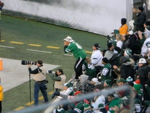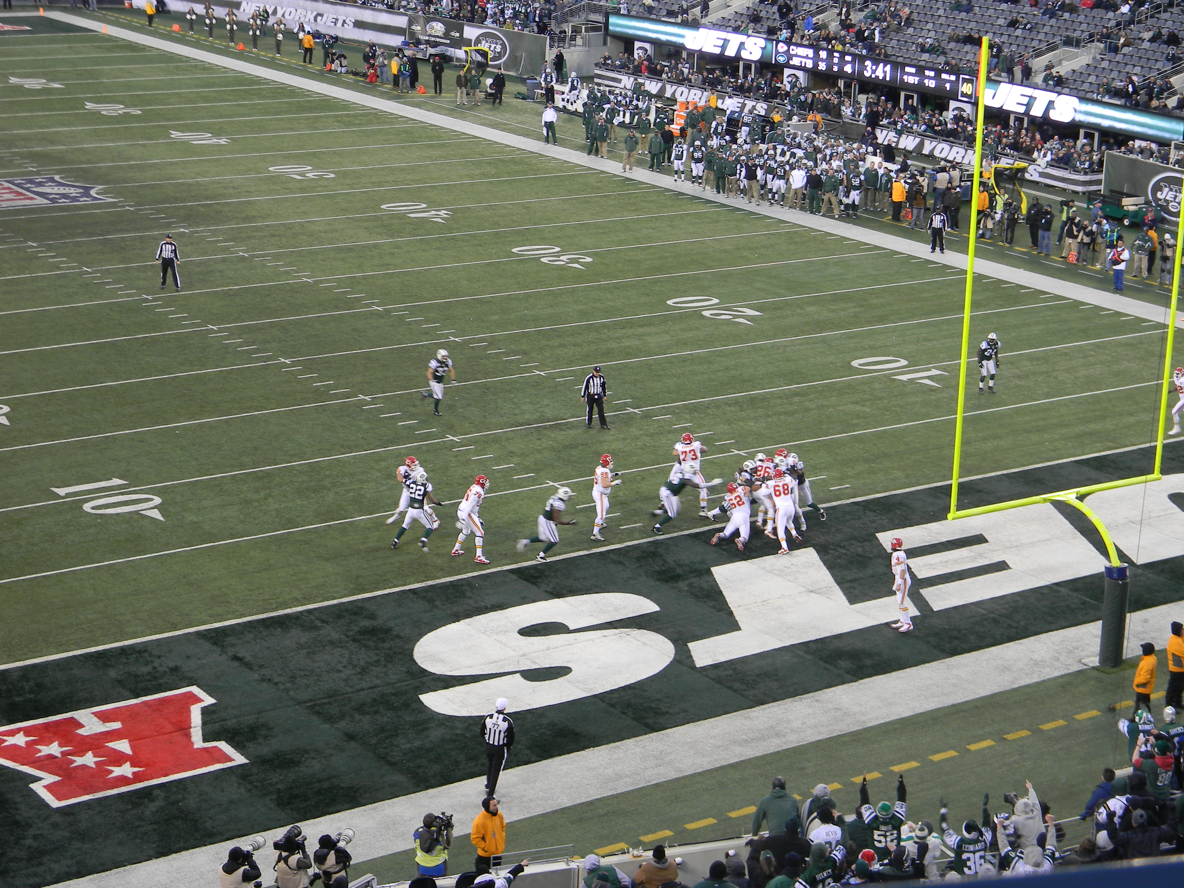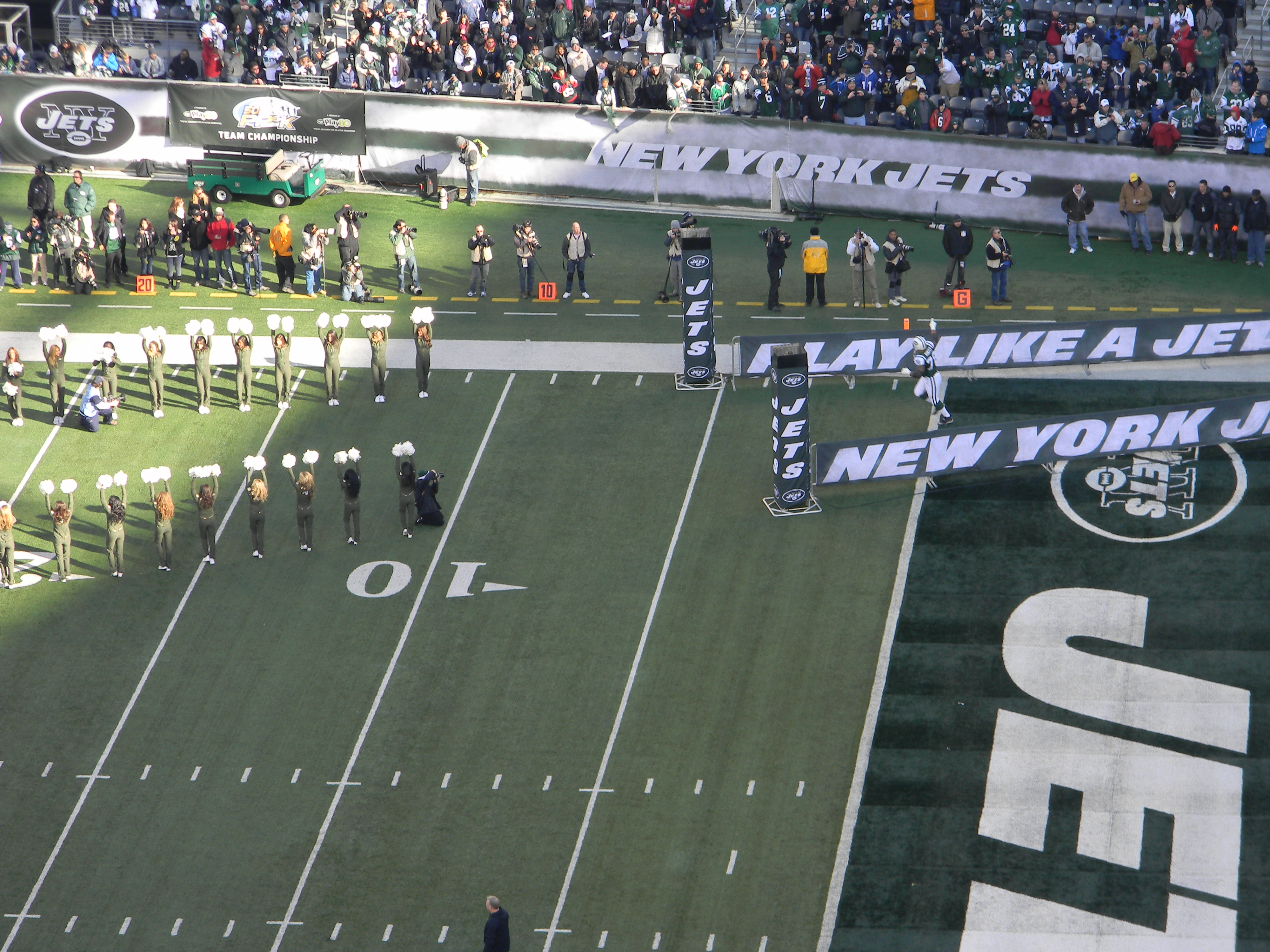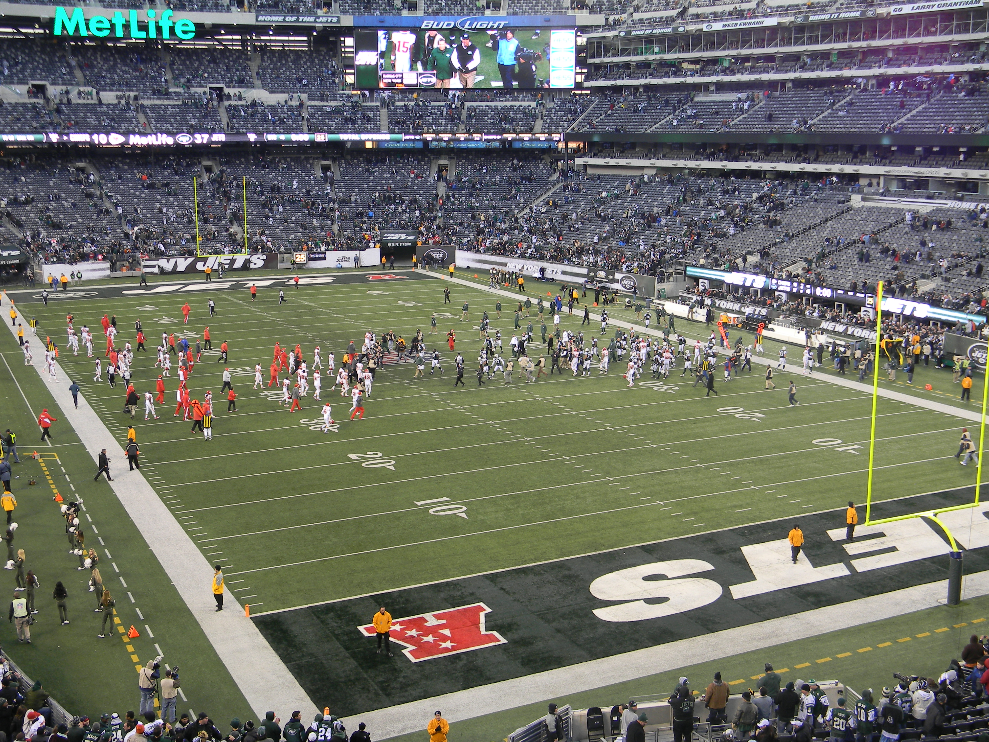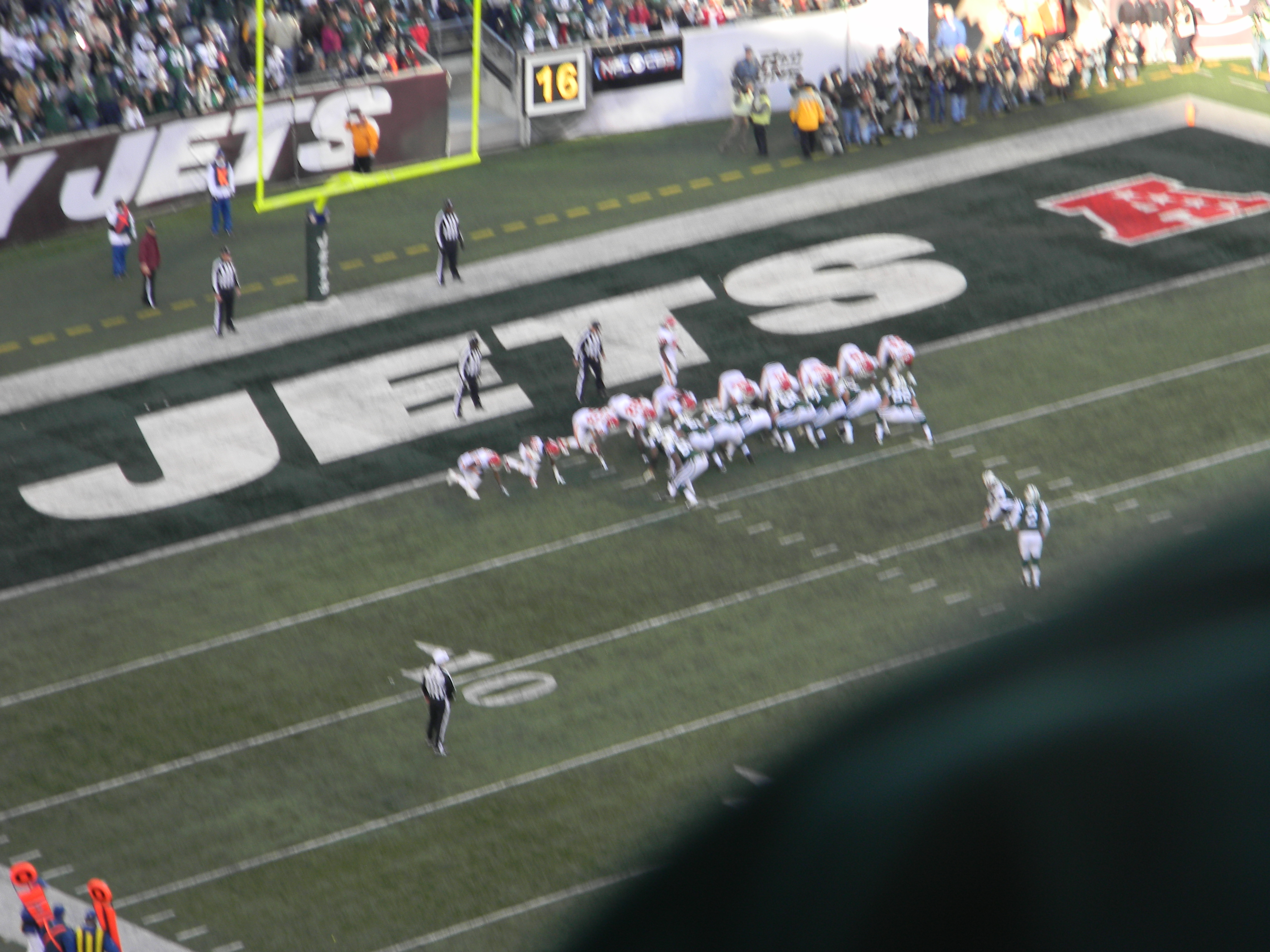 Of course, not on the day I was scheduled to go a game. But as you see, my friend and I dressed appropriately. A few years ago, I read an article about dressing for games during the playoffs at Lambeau Field. I remember the guy had like 10 different layers, but most importantly, thermals with the butt flap. We don’t have it that bad, at least, not yet. But for me, I had thermals on, a sweatshirt, my Jets jersey, jeans, a North Face, a scarf, and I had gloves. I didn’t really need the gloves, and I had a hat for a break-in-case-of-emergency. My friend wore her Jets cap though, for reasons other than weather (I’ll get to that in a minute).