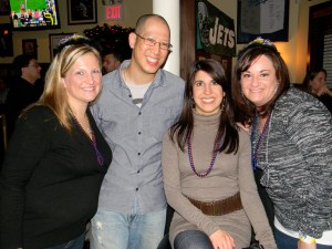 Dee and I were greeted with a strawberry margarita (courtesy of Kevin’s battery-operated margarita maker), and there were comforts of home such as yummy food and wood-burning stoves. We didn’t really need it though, since you can see I lost my scarf and had my coat al fresco after a bit (plus I was drinking a frozen alcoholic drink). The guy on top of the truck was leading us in a J-E-T-S chant, and the dude in the middle of our photo is Frank, the ringleader of the L11 tailgate. There was also a filming of a television show that these dudes were pitching to Food Network, for I guess best tailgate burger. Frank was the winner of the golden spatula.