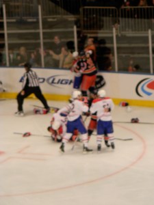We sat in the middle of the 20th row. J struck up a conversation with the women next to us…actually, a mother and daughter team. Turns out, they knew their shit about hockey, the teenager even had a fantasy hockey team. I’ve done fantasy baseball before, but I generally lose interest by the end of the season. Fantasy hockey, though, is a whole ‘nother level.